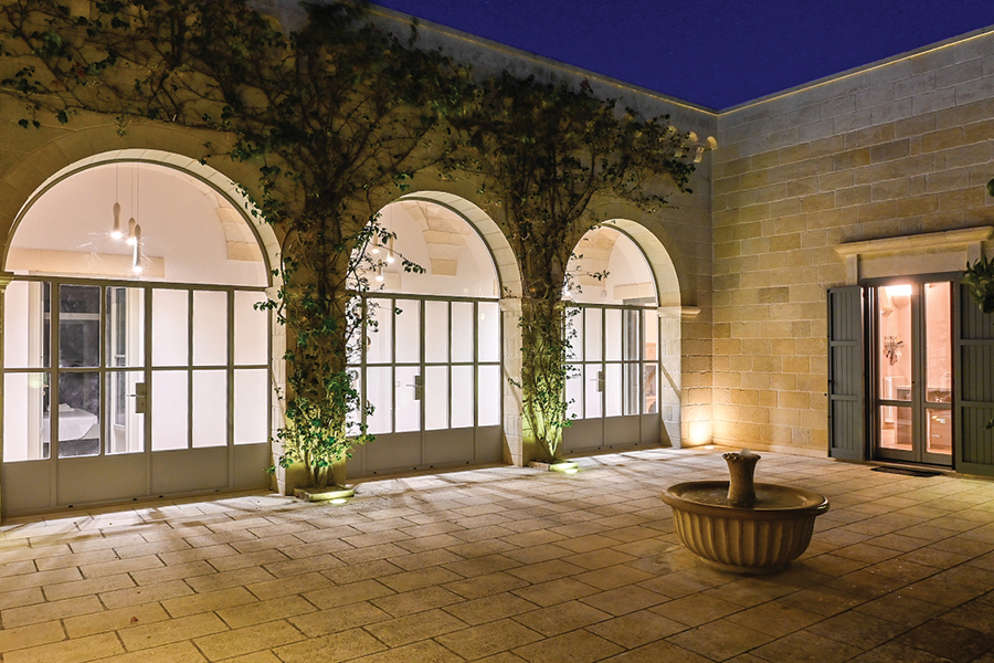 Features a welcoming living space with a fireplace and direct access to the courtyard, garden, and olive grove.